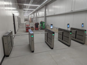 If an abnormal temperature is detected, the security guard then scans the employee through the designated exit lane using a specially integrated RFID card that allows a single entry in the entry direction without triggering any “wrong way” alarms. The employee is then sent directly to the health station through a designated lane for treatment. The three entrance lanes are also set for free egress to be used during breaks and at the end of shifts when large amounts of employees are exiting the facility at once. Like the designated exit lane, the entry lanes are also equipped with “wrong way” sensors that will activate if an attempt is made to admit an unauthorized person into the facility by opening a lane from the exit side. These lanes can be field upgraded in the future to require scans for egress if desired. That way, the packing company can have a report of who is inside the building if they haven’t exited already. These lanes are also integrated into the facility’s life safety systems, so if the fire alarm is activated or there is a loss of power all lanes are released to allow free egress out of the building.