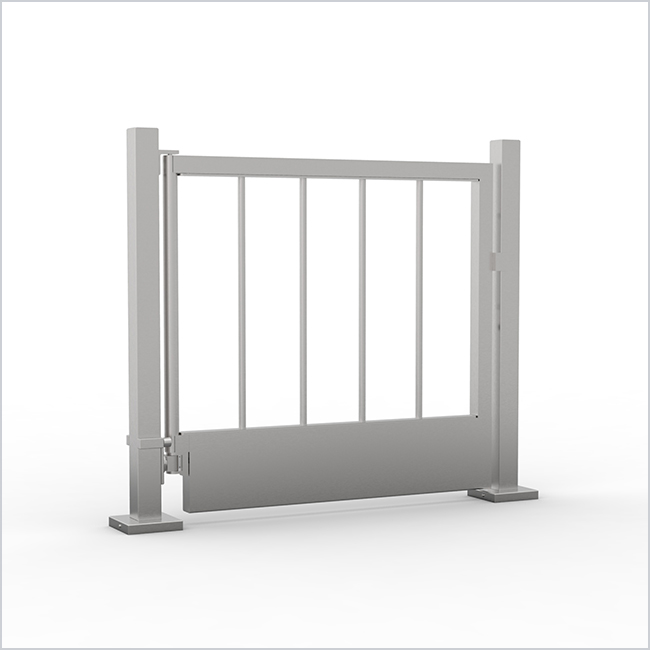 GDO This self-closing double gate set opens in a single direction; often used to control shopping cart access in grocery and retail stores.